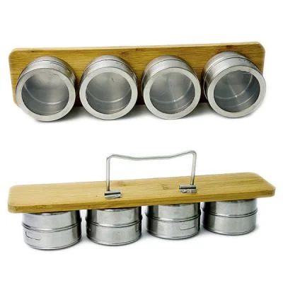 Цвет: хром/коричневый. Вес: 347 г. Комплектация: емкость – 4, подставка – 1. Материал: дерево, магнит, нержавеющая сталь. Размеры: подставка - 29х7 см, емкость - 6х4 см. Упаковка: картонная коробка.