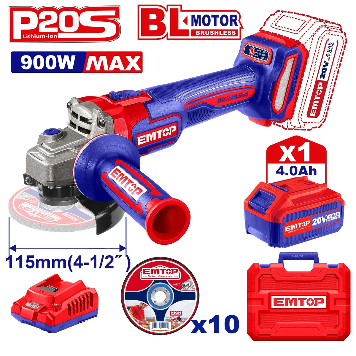 Аккумуляторная угловая шлифмашина EMTOP ELAG211541 предназначена для различных работ по металлу и другим материалам.