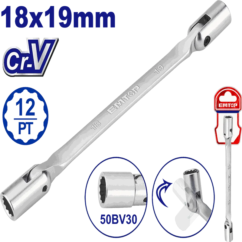 Комбинированный ключ с гибкой головкой и 12-точечным гнездом Размер: 19 мм Длина: 247 мм Материал гнезда: 50BV30 Материал ключа: углеродистая сталь 45# с термообработкой Хромированное, матовое покрытие
