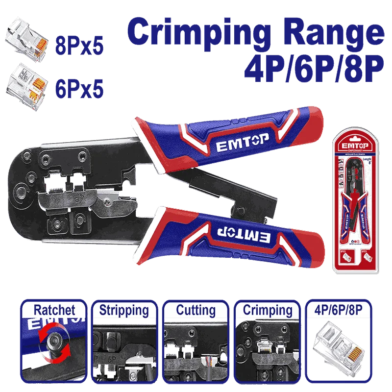 Модульные щипцы для обжима вилок Используются для обжима клемм сетевых и телефонных линий Диапазон обжима: 4P, 6P, 8P Длина: 8 дюймов Конструкция храповика, позволяющая экономить трудозатраты Три функции: Обжим, Зачистка, резка Ручка из ПВХ уникального дизайна С 10 шт. проходных разъемов: 8Px5pcs; 6Px5pcs