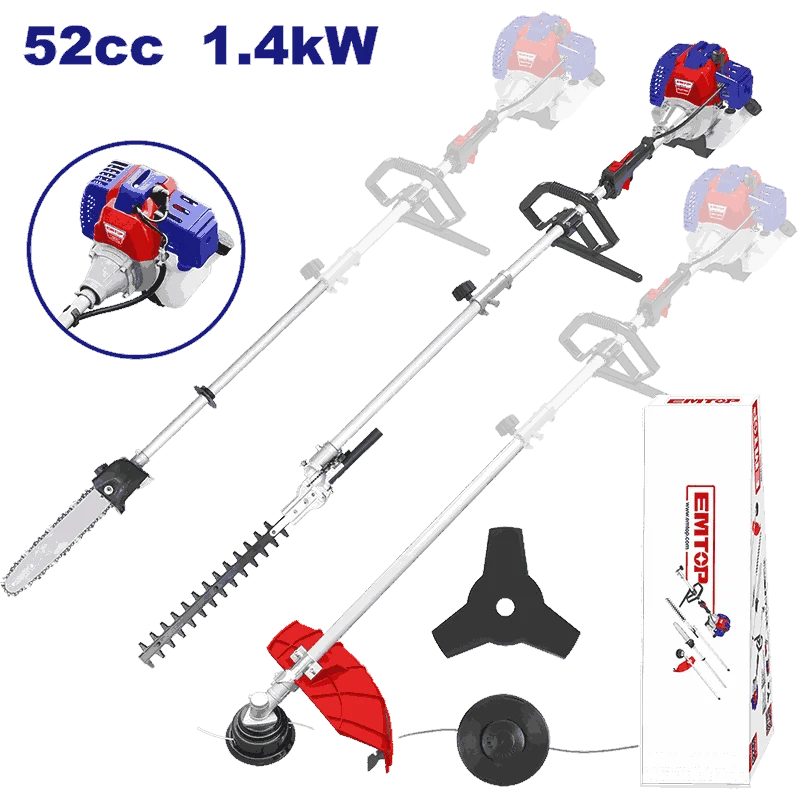 Размер катушки: 2,4 мм х 4 м Патрубок для подачи топлива: двухслойный полиуретановый патрубок Легкий запуск Мощный 2-тактный двигатель Комплектуется 1 триммером для травы Комплектуется 1 кусторезом С 1 шт. триммера для живой изгороди С 1 шт.