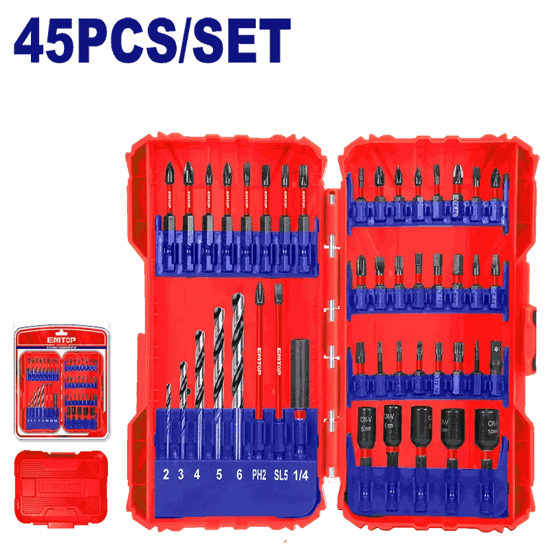 Набор ударных отверток из 45 штук Набор ударных отверток диаметром 50 мм из 8 штук PH1 / PH2 /PZ1 / PZ2/SL4 / SL5/T23/T30 23шт набор ударных отверток диаметром 25 мм PH1 / PH2 / PH3 /PZ1/ PZ2 / PZ3 /SL3/ SL4 / SL5 /SL6/H3/H4/H5/H6/S1/S2/S3/T10/T15/T20/T25/T30/T40 1 шт. адаптер 2 шт. набора ударных отверток диаметром 89 мм PH2 / SL5 5 шт. сверл HSS 2,3,4,5,6 мм 5 шт. магнитных гаек диаметром 48 мм 6,7,8,9,10 мм 1 шт. держатель для отверток Упакован в двойной блистер