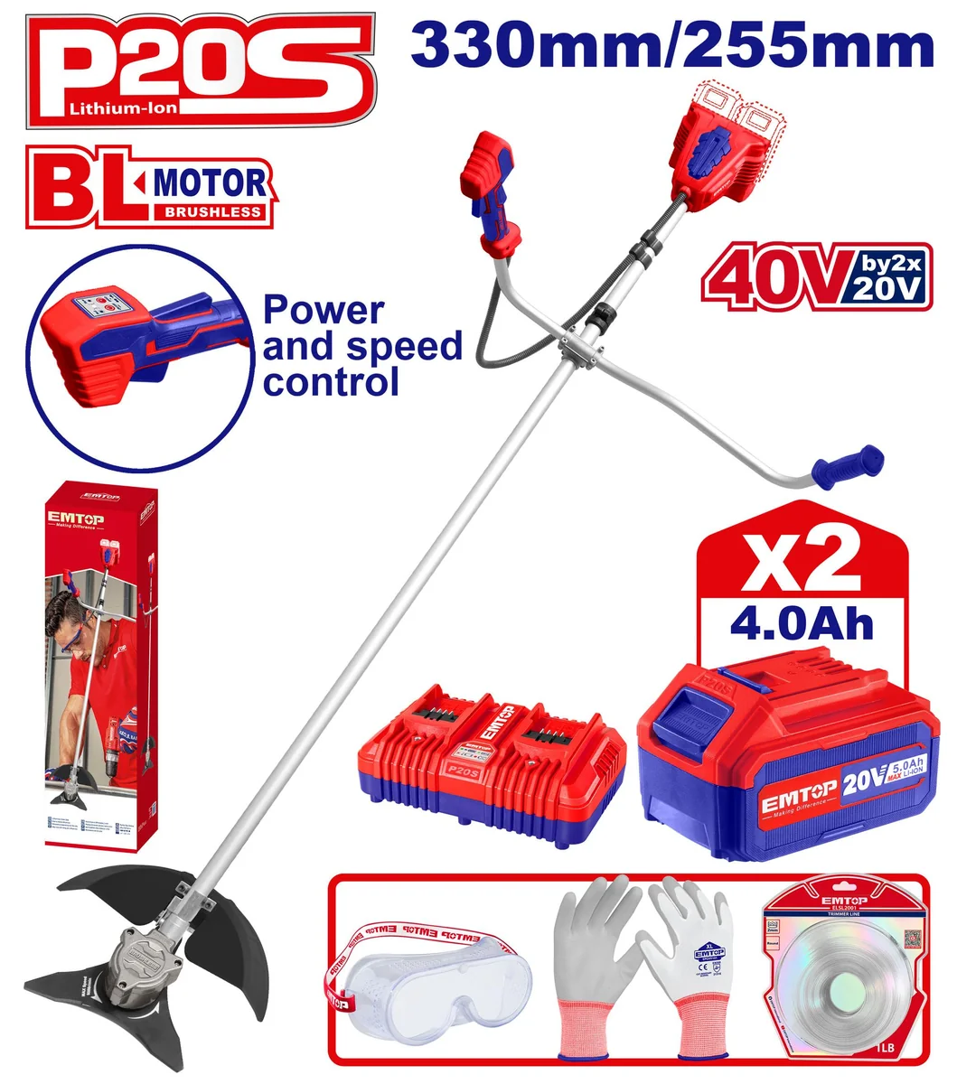 В комплект входят: катушка с леской, защитные очки, перчатки с полиуретановым покрытием, трёхлопастной нож, плечевой ремень, 2 аккумуляторных батареи ёмкостью 4 Ач, двухпортовое зарядное устройство.