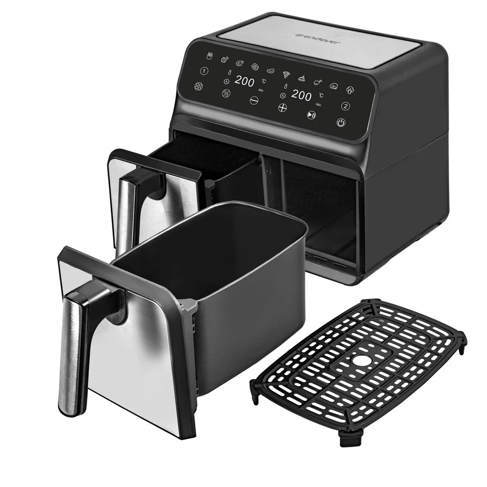 2 контейнера с антипригарным покрытием, 10 автоматических программ, LED дисплей, Таймер на 60 минут, Сенсорная панель управления, Регулировка времени и температуры приготовления для каждого контейнера, Возможность приготовления 2-х разных блюд одновременно, Обжаривание продуктов циркулирующим горячим воздухом без использования масла, Равномерная конвекция для лучшей прожарки, Автоматическое отключение, Защита от перегрева |