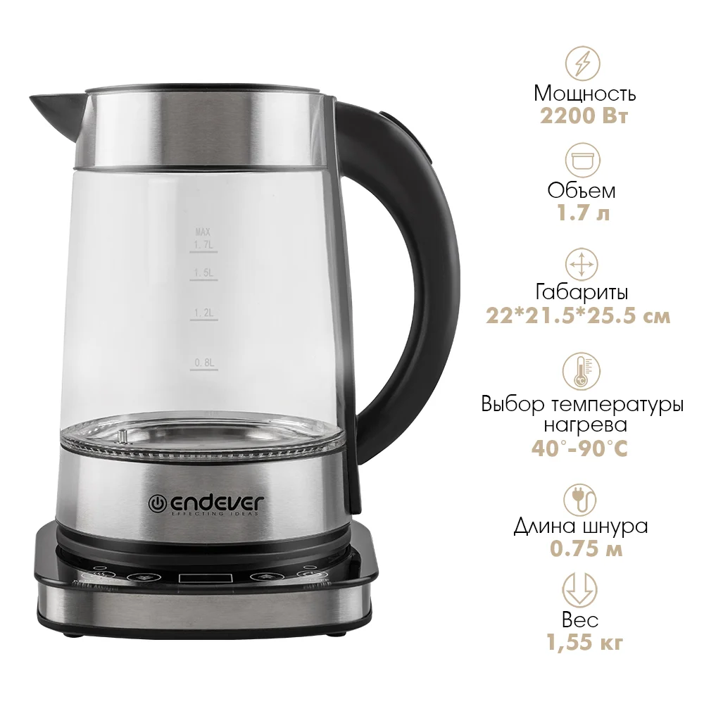 Электрический чайник Endever KR-367G создан для настоящих ценителей чая. С мощностью 2200 Вт, данная модель нагревает воду быстро и эффективно, позволяя вам наслаждаться свежим горячим напитком всего за несколько минут.
