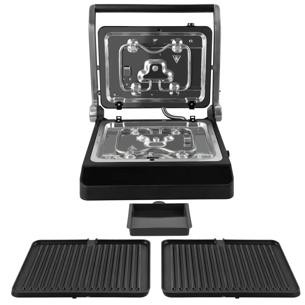 Размеры рабочей поверхности 29,8х22 см позволяют приготовить несколько порций одновременно, а открывающийся на 180 градусов пресс-гриль делает уход за прибором легким и удобным. Съемные панели и лоток для сбора жира облегчают процесс чистки и обслуживания.