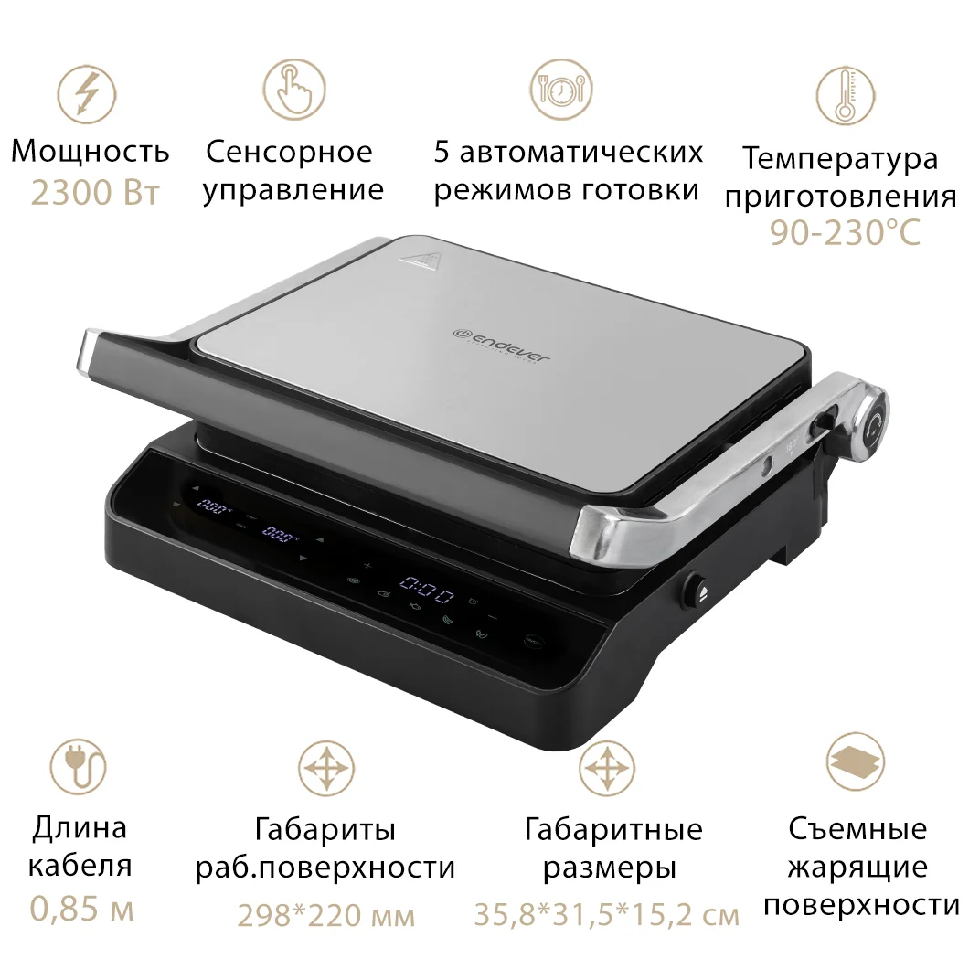 С мощностью 2300 Вт и терморегулятором с диапазоном от 90 до 230 градусов, этот пресс-гриль обеспечит вам идеальный результат готовки каждый раз. Антипригарное покрытие и сенсорная панель управления делают использование прибора максимально удобным и приятным.
