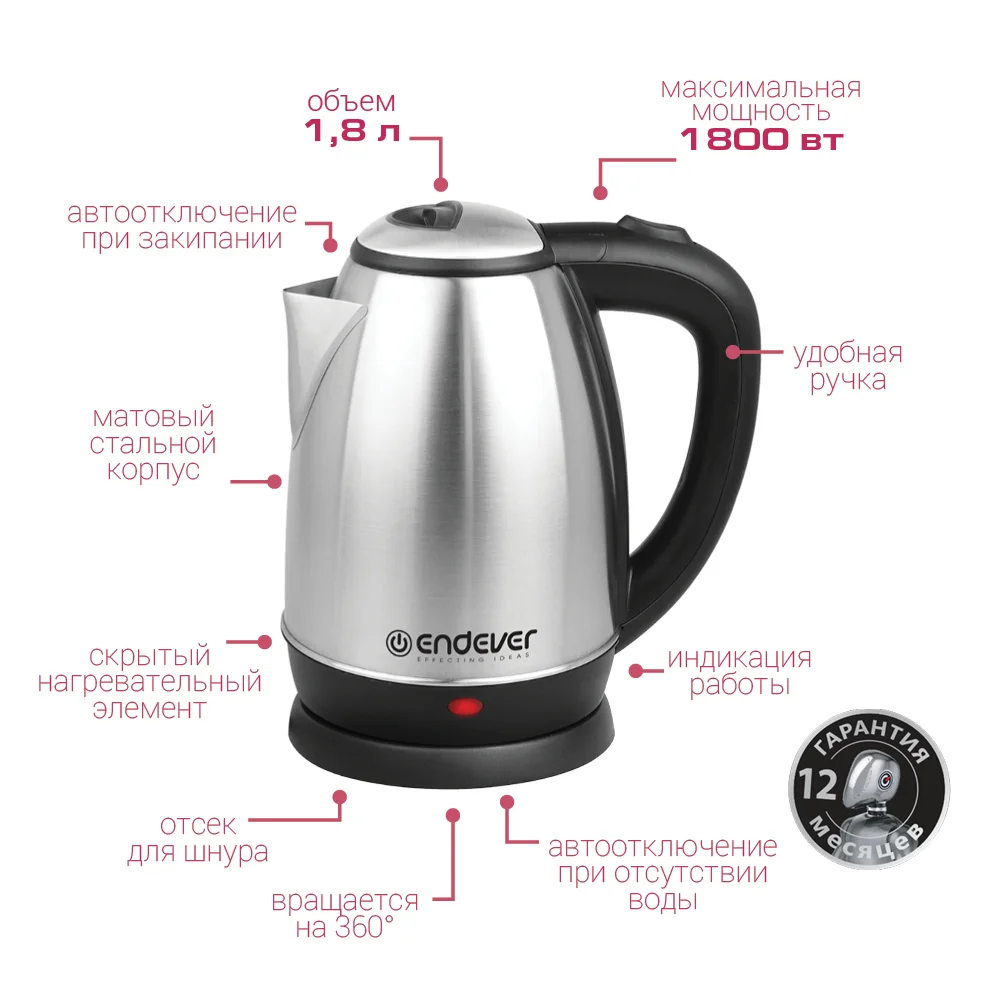 Высокая мощность устройства 1800 Вт позволяет вскипятить воду за считанные минуты, объем которого рассчитан на 1,8 литров, благодаря чему Вы сможете напоить чаем всю семью или большую компанию друзей .