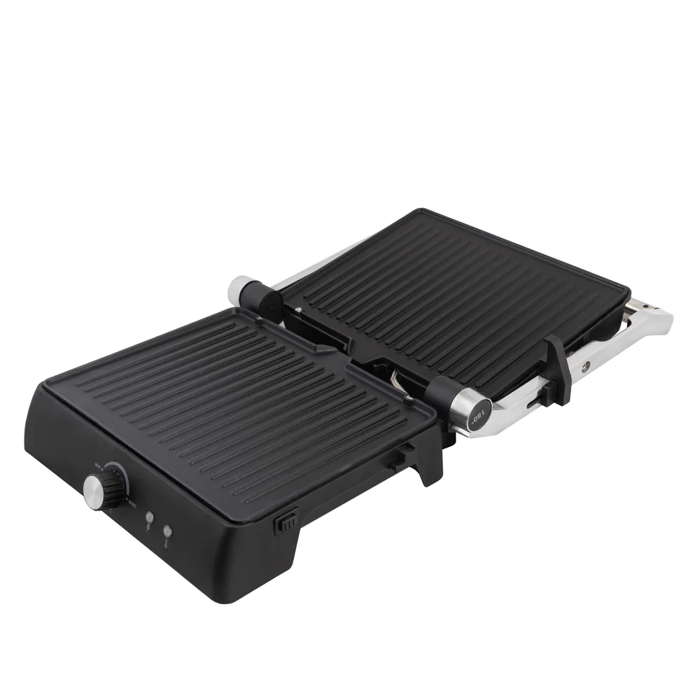 | Особенности и дополнительные функции | Регулировка температуры нагрева, Съемные жарящие поверхности, Ненагревающаяся эргономичная ручка, Антипригарное покрытие поверхностей, Открывается на 180°, Фиксируется в виде пресса на любой высоте, Индикаторы включения и температуры, Нескользящие прорезиновые ножки, Поддон для сбора жира |