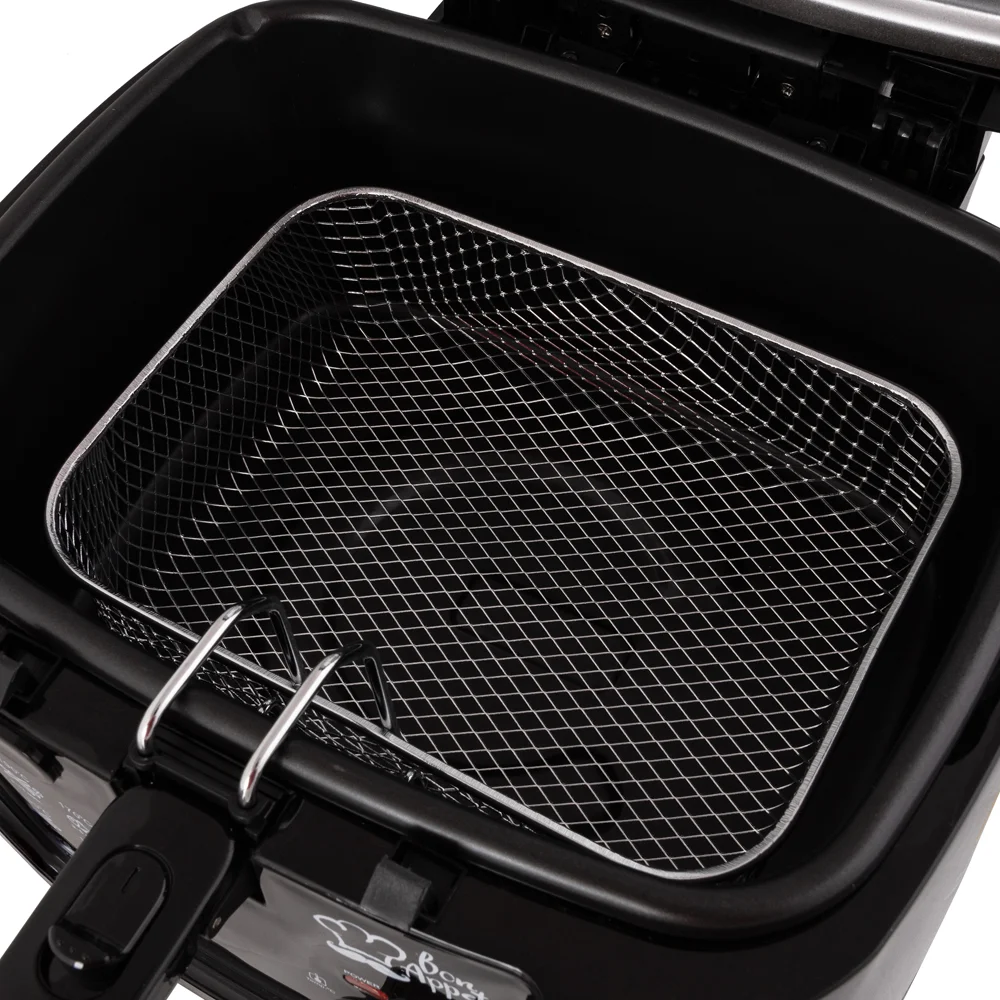 Дополнительной особенностью фритюрницы является система фильтров против запаха и жира, а также кнопка блокировки крышки, которая обеспечивает полную безопасность в процессе приготовления.