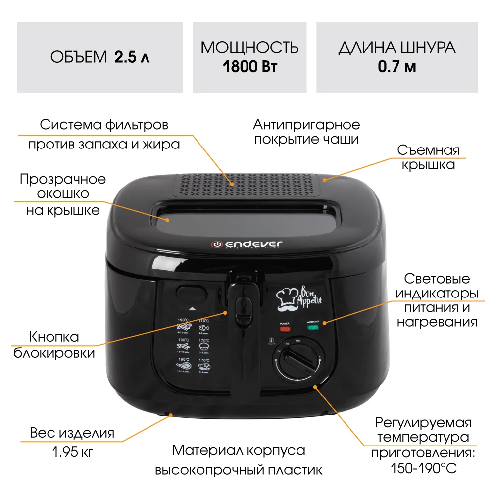 Температура приготовления: 150-190°С, Регулировка температуры приготовления, Минимальный объем масла 1,5 л, Световые индикаторы питания и нагревания, Прозрачное окошко на крышке, Корзина для фритюра с ручкой - 221*207*120 мм, Антипригарное покрытие чаши, Система фильтров против запаха и жира, Кнопка блокировки, Съемная крышка |