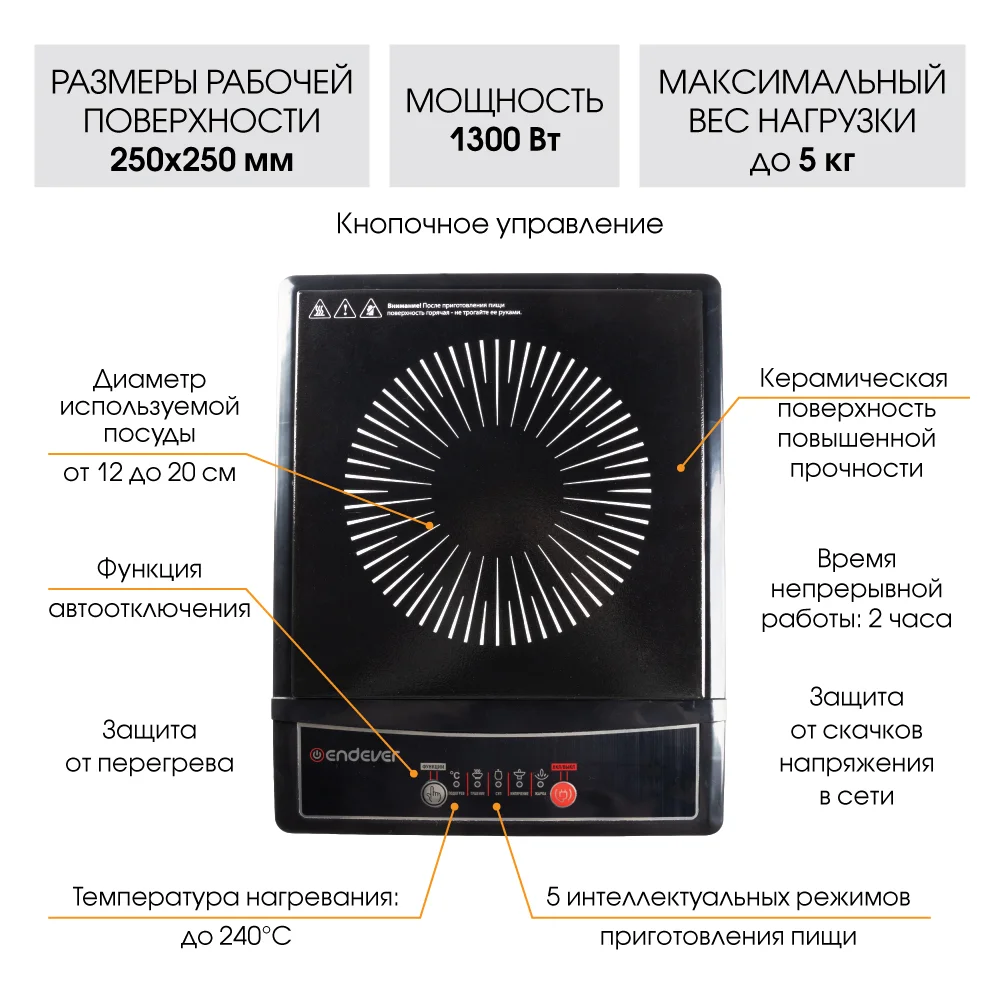 | Особенности и дополнительные функции | Температура нагревания: до 240°С, 5 интеллектуальных режимов приготовления пищи, Кнопочное управление, Керамическая поверхность повышенной прочности, Диаметр используемой посуды от 12 до 20 см, Время непрерывной работы: 2 часа, Функция автоотключения, Защита от скачков напряжения в сети, Защита от перегрева, Легко мыть |
