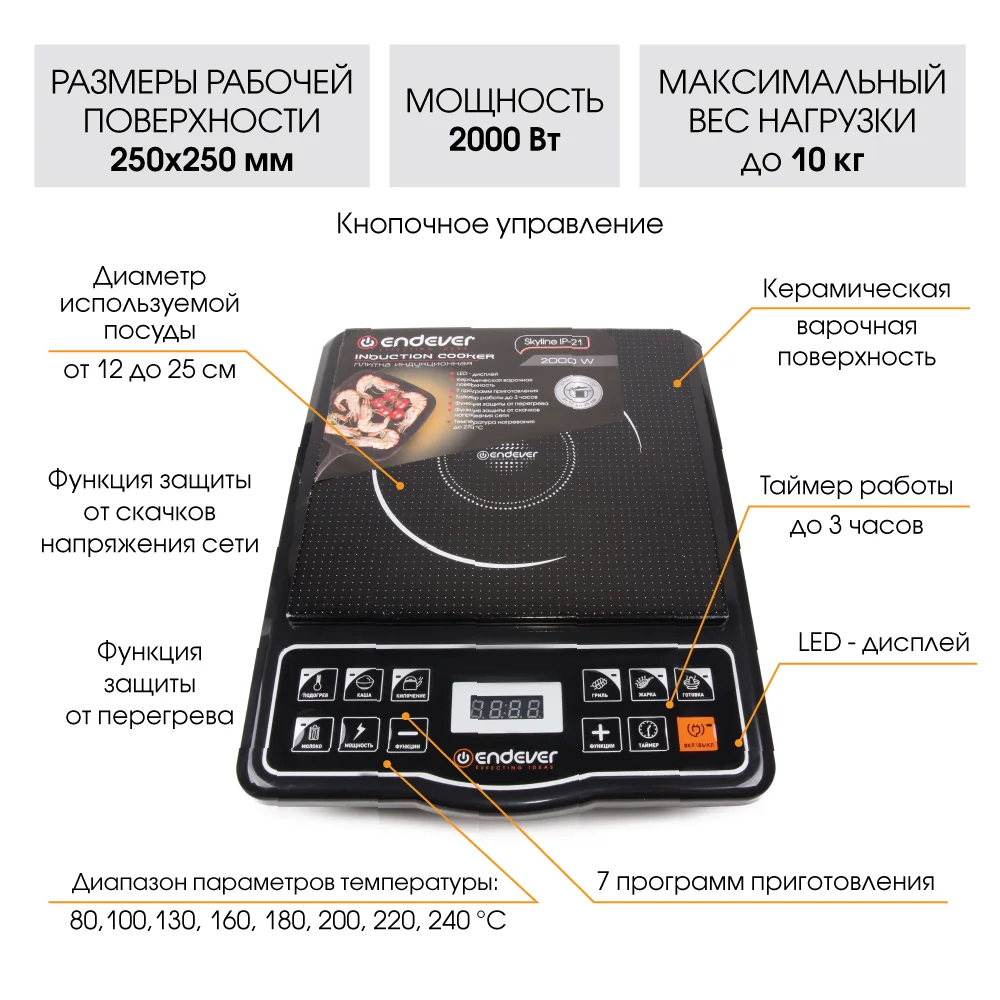 ЭКОНОМИЧНОСТЬ. Индукционная плитка Endever Skyline IP-21 потребляет в несколько раз меньше электроэнергии, чем обычная электрическая, за счет того, что конфорка автоматически подстраивается под диаметр дна посуды и нагревает только необходимую площадь. Она экономит не только энергию, но и Ваше время. За счёт большой мощности (2000 Вт) быстро нагревается и постоянно поддерживает необходимую температуру, что значительно сокращает время приготовления пищи.