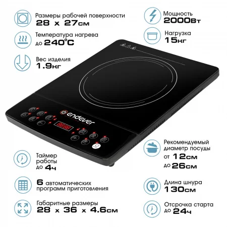 Хорошие показатели мощности у индукционной плиты ENDEVER Skyline IP-57 в 2000 Вт и индукционный принцип нагрева позволяют быстрее, чем на обычной электрической плите, разогреть пищу или вскипятить воду. 6 автоматических программ помогут Вам с выбором способа приготовления того или иного блюда. Таймер работы до 4 часов и таймер отсрочки старта до 24 часов помогут Вам не думать о том, когда начать и сколько по времени ждать, когда приготовятся Ваши шедевры на данной плите.