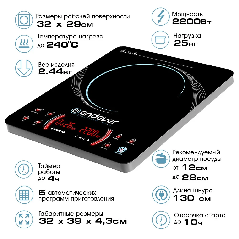 Модель индукционной плиты ENDEVER Skyline IP-59 выделяется среди своих конкурентов на рынке наличием двух LED дисплеев, на которых раздельно отображается информация о времени готовки или таймере и мощности или температуры приготовления. С таким показателем мощности в 2200 Вт данная модель занимает лидирующие позиции на рынке. Выбрав данную модель, Вы получите, помимо стильного и элегантного внешнего вида еще и мощного и функционального помощника на Вашей кухне.