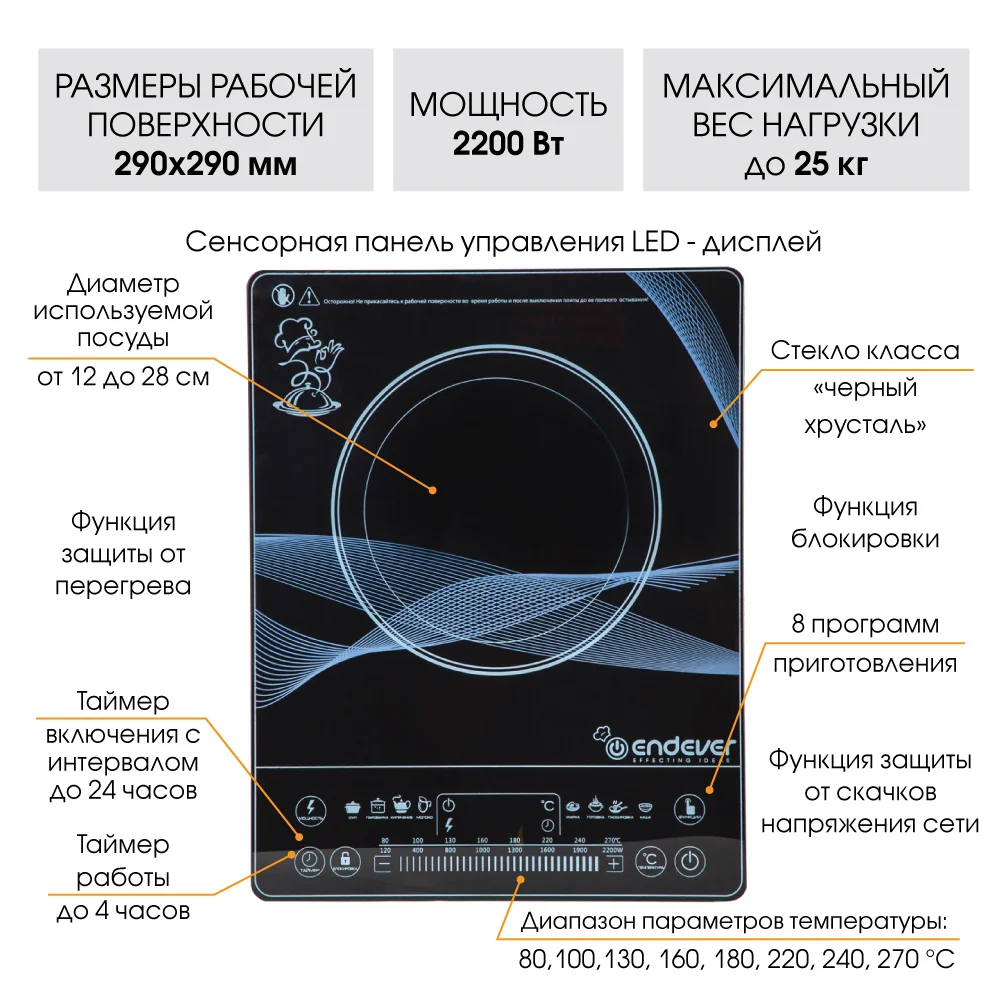 Индукционная настольная плита ENDEVER Skyline IP-32 – плита для самых требовательных людей в вопросах приготовления вкусной и полезной пищи. Первое, что бросается запоминается при первом взгляде – это глянцевый черный вид поверхности плиты и рисунок с 3D эффектом на поверхности. Варочная поверхность сделана из стеклокерамики класса «Черный хрусталь» - очень прочная поверхность, способная выдержать до 25 кг нагрузки.