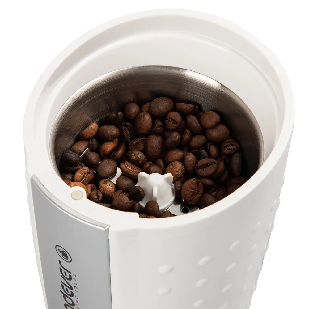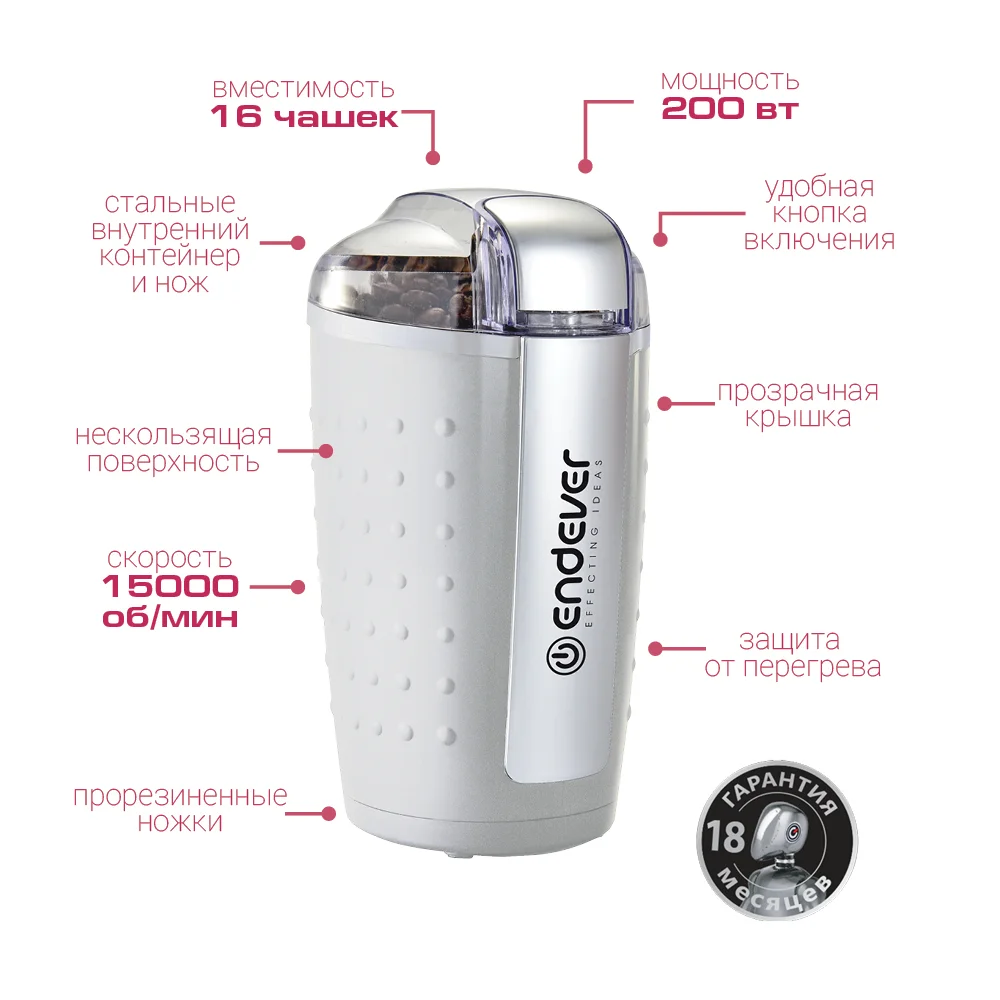 | Особенности и дополнительные функции | Лезвие и чаша из нержавеющей стали, Специальная поверхность, предотвращающая скольжение, Удобная кнопка включения, Высококачественный ABS-пластик, Вместительность: 100 г или 16 чашек кофе, Прозрачная верхняя крышка, Прорезиненные ножки |