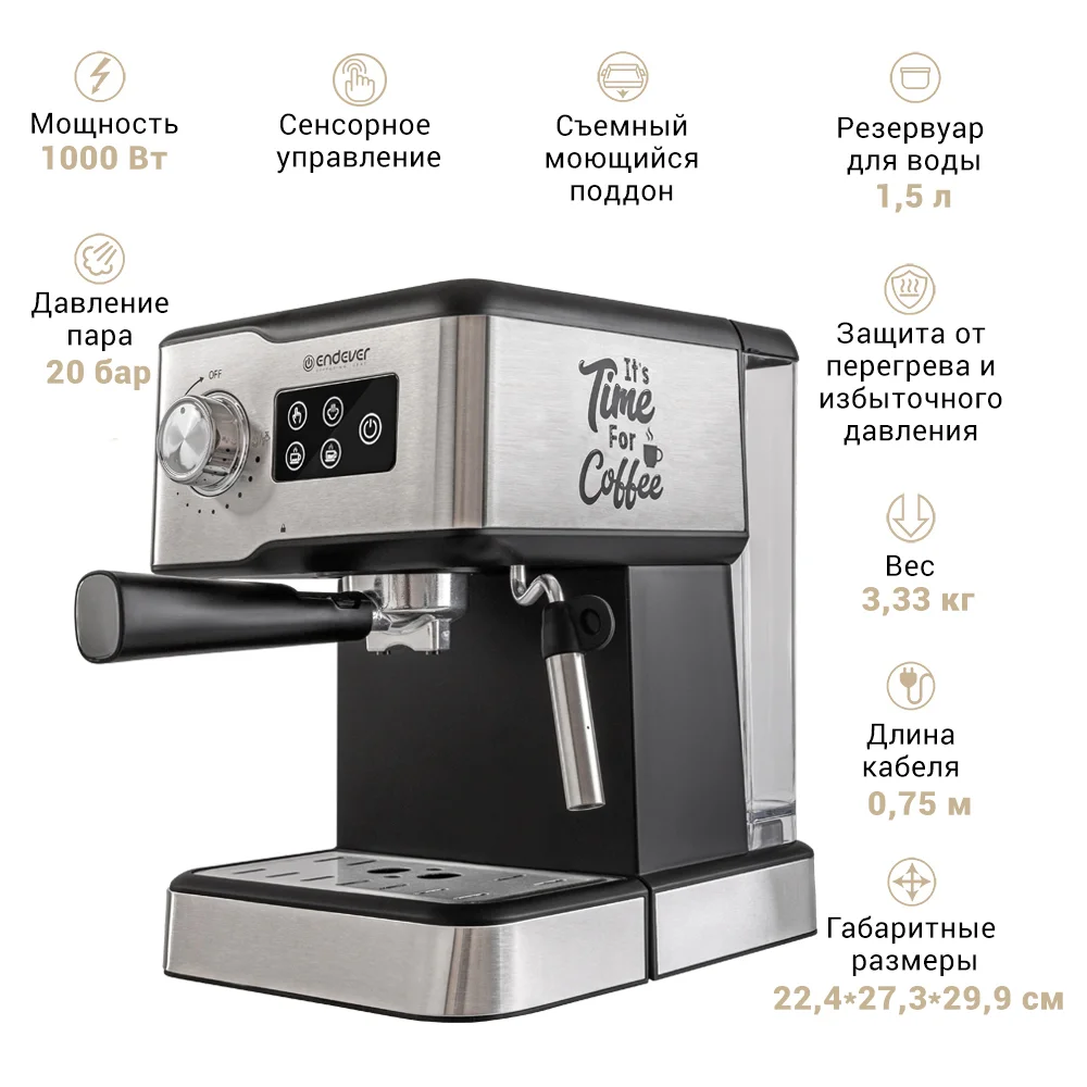 Тип кофеварки: рожковый, Тип используемого кофе: молотый, Подходит для приготовление эспрессо и капучино, Сенсорное управление со световой индикацией, Съемный бак для воды, Насадка "ПАНАРЕЛЛО" для приготовления плотной молочной пены, Съемный моющийся поддон для сбора воды, Защита от перегрева и избыточного давления, Съемный фильтр на одну и две чашки из нержавеющей стали, Площадка для подогрева чашек, Функция выбора температуры кофе, Функция памяти объема напитка, Функция автоотключения |