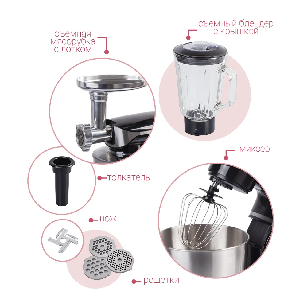 Основание процессора, Съемная чаша с крышкой, Насадка для перемешивания, Крюк для теста, Венчик для взбивания, Съемный блендер с крышкой, Съемная мясорубка с лотком и толкателем, Три дисковые стальные решетки для приготовления фарша, Лопатка кулинарная, Руководство по эксплуатации, Гарантийный талон |