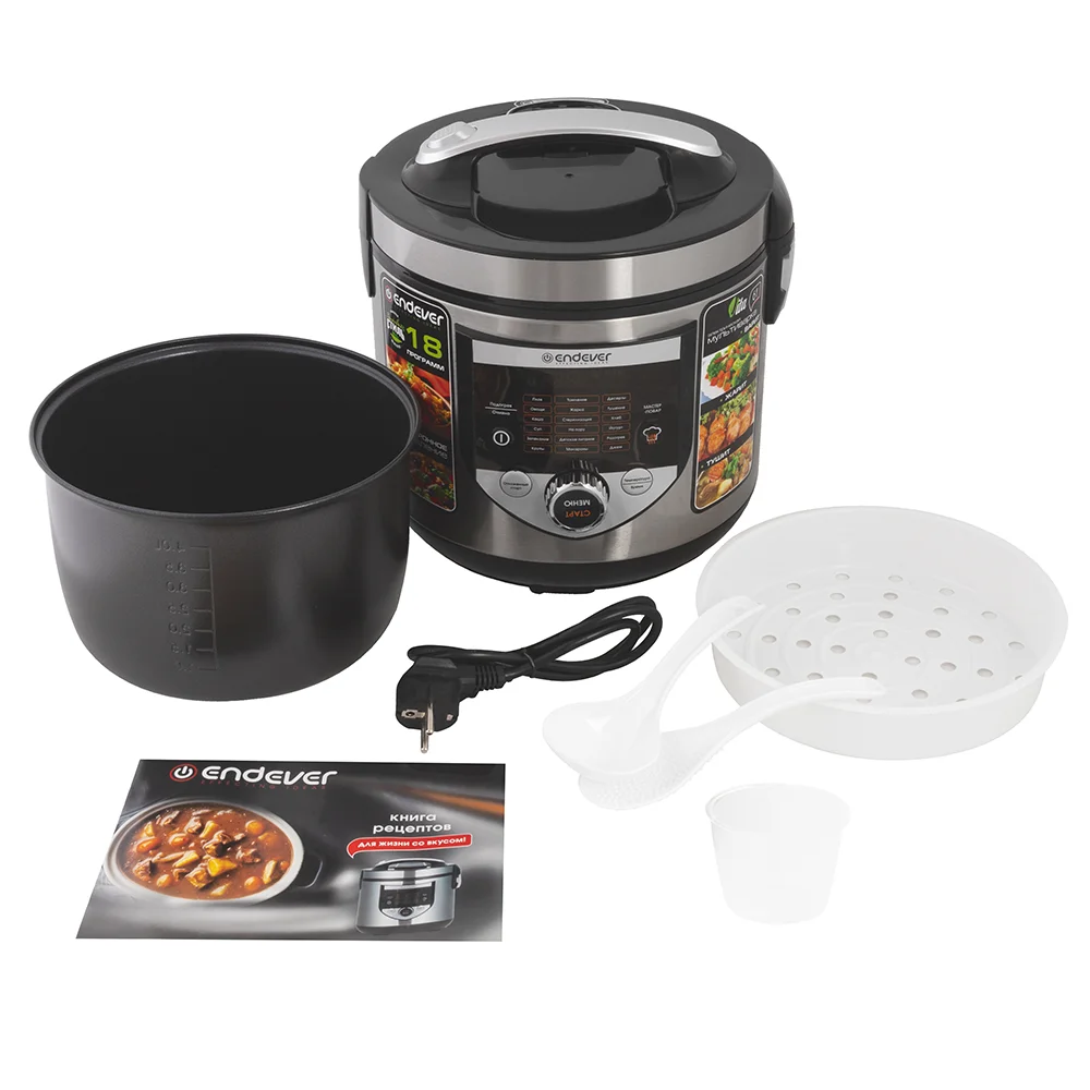 Мультифункциональная помощница ENDEVER VITA-61 комплектуется приятными аксессуарами: книгой рецептов, контейнером-пароваркой, черпаком для супа, ложкой для крупы и мерным стаканчиком.