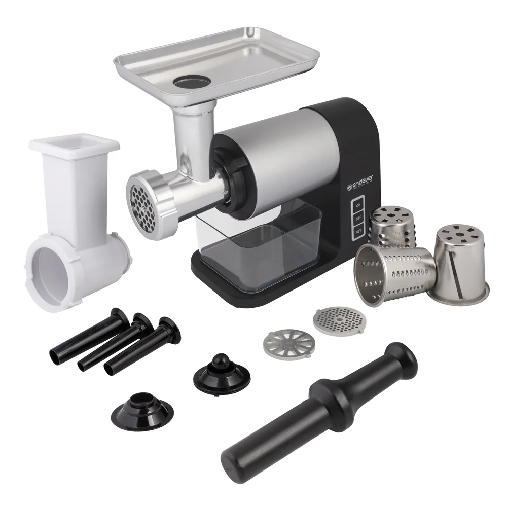 В комплект входят: насадки для приготовления колбасок и кеббе, овощерезка с возможностью натирания, шинковки, нарезания тонких слайсов, пластиковая чаша для измельчённых продуктов и другие аксессуары.