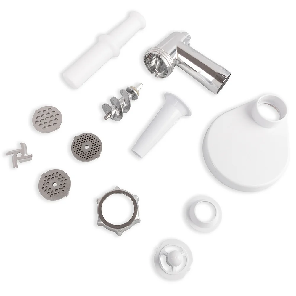 | Комплект поставки | Мясорубка, Кованый стальной нож, 3 решетки: с отверстиями 3 мм/5 мм/7 мм, Насадки для приготовления колбас и кебаб, Толкатель, Руководство по эксплуатации, Гарантийный талон |