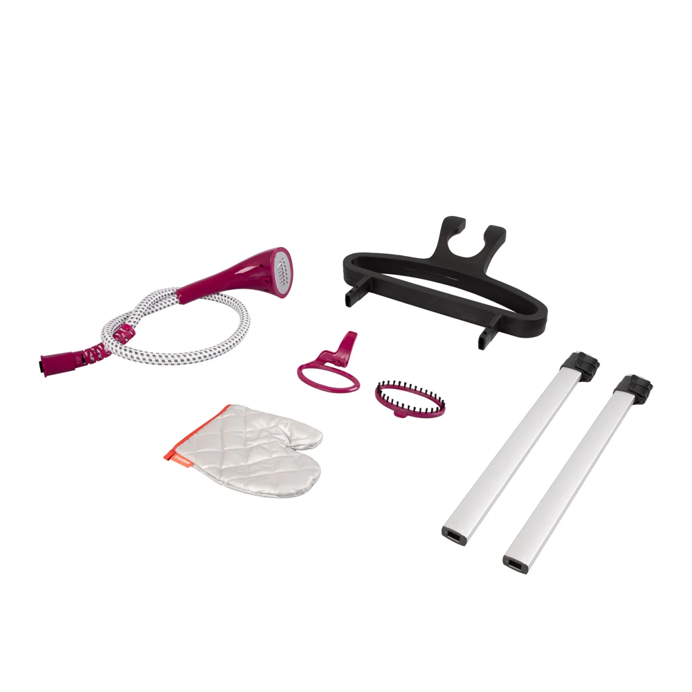 | Комплект поставки | Отпариватель, Вешалка, держатель распылителя, Насадка зажим для наведения стрелок на брюках, Двойная телескопическая стойка, Универсальная щетка-насадка с длинной полимерной щетиной, Рукавица, Руководство по эксплуатации, Гарантийный талон |