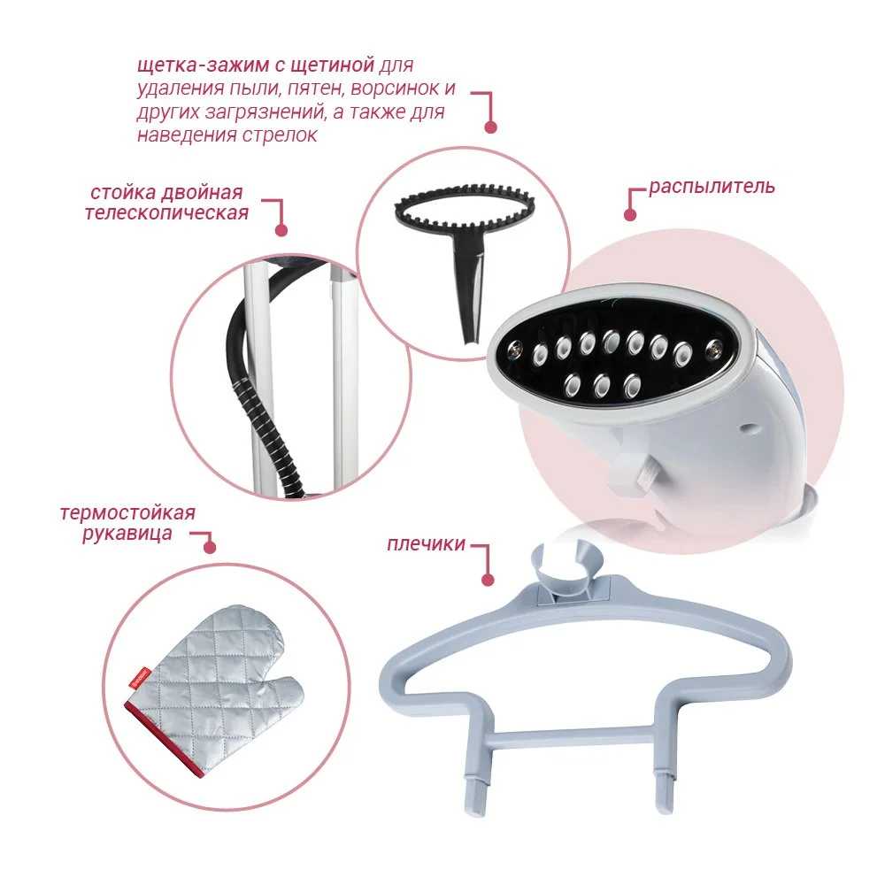 | Комплект поставки | Отпариватель, Удобная вешалка, Универсальная щетка-насадка с длинной полимерной щетиной, Двойная металлическая телескопическая стойка, Тефлоновая термостойкая защитная рукавица , Съемный гладильный столик |