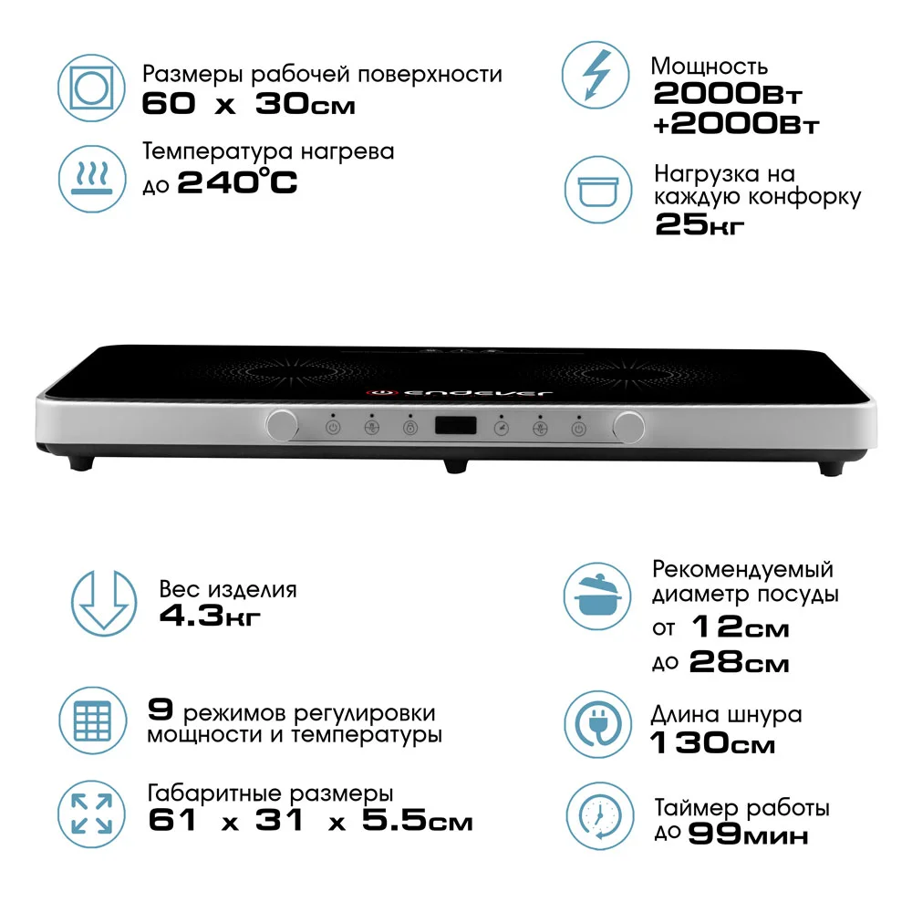Максимальная мощность каждой конфорки индукционной плиты ENDEVER Skyline IP-61 составляет 2000 Вт, температура нагрева до 240°С. Внушительные размеры варочной поверхности 60*30 см позволят использовать посуду до 28 см, и даже немного больше. Наличие таймера работы до 99 минут помогут Вам задать необходимое время приготовления Ваших блюд. Управление каждой конфорки осуществляется при помощи сенсорного управления с удобным джойстиком с плавной регулировкой. 9 режимов регулировки мощности и температуры помогут подобрать Вам оптимальный режим для каждого блюда.