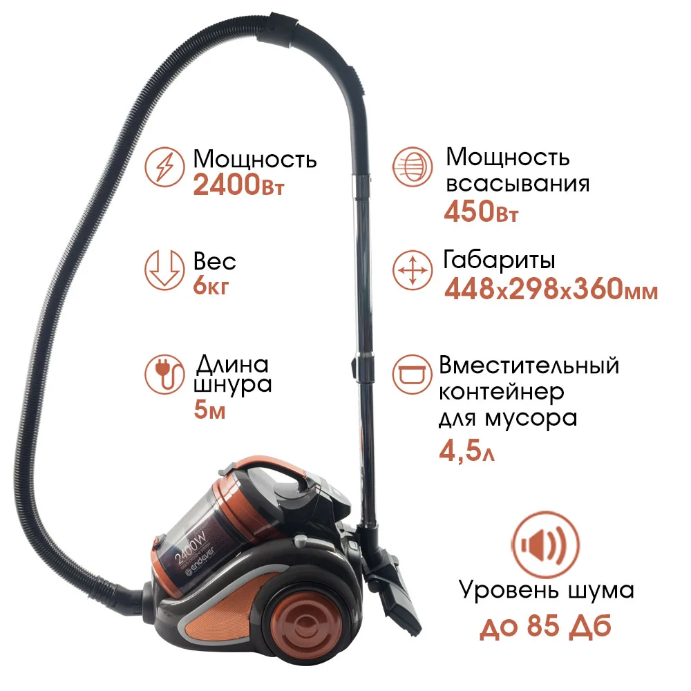 Пылесос SKYCLEAN VC-650 легко справится с любым загрязнением благодаря своей высокой мощности 2400 Вт. А имея мощность всасывания 450 Вт очистит любой тип поверхности, будь то паркет, ламинат, ковролин или ковер с самым длинным ворсом.