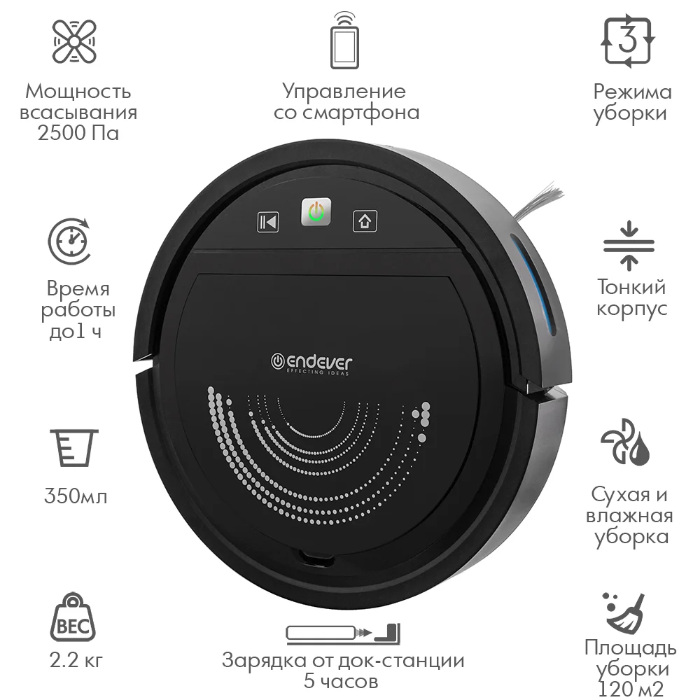 Endever Spectre-99 - это современный и умный робот-пылесос, который обеспечит безупречную чистоту в вашем доме. Он оснащен мощной Li-ion батареей с емкостью 2500 мА/ч, благодаря чему может работать до 60 минут без подзарядки.