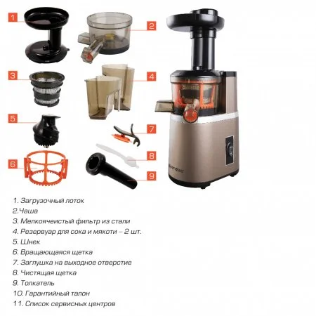 | Комплект поставки | Соковыжималка, Загрузочный лоток, Чаша, Мелкоячеистый фильтр из стали, Резервуар для сока и мякоти - 2 шт., Шнек , Вращающаяся щетка, Заглушка на выходное отверстие, Чистящая щетка, Толкатель, Гарантийный талон, Список сервисных центров, Руководство по эксплуатации |