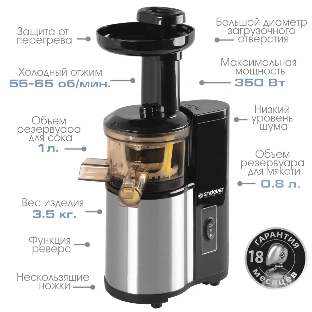 Компактный размер и стильный дизайн шнековой соковыжималки Endever Sigma-95 легко впишет ее в интерьер кухни самой взыскательной хозяйки!