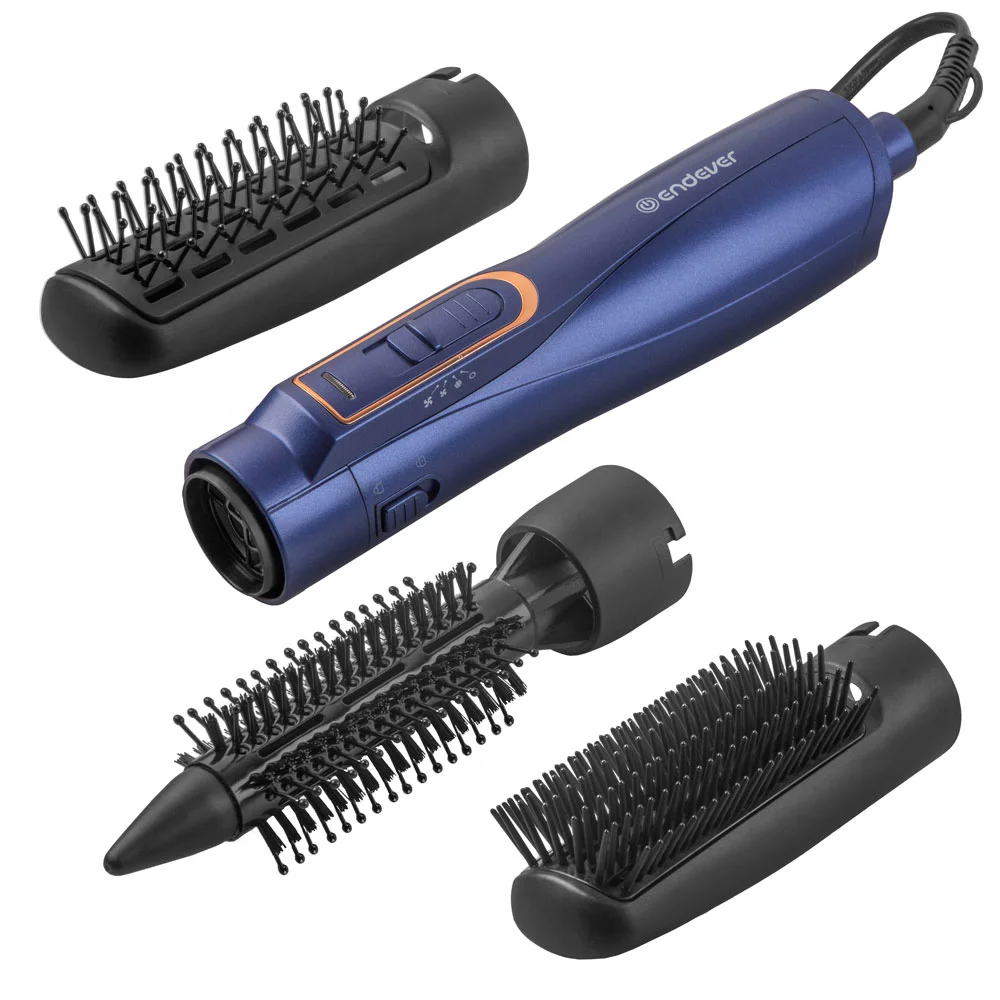 Endever Aurora-501 имеет целых 3 сменных насадки в комплекте: две насадки-щетки с разной степенью густоты щетинок для сушки и выпрямления волос различной длинны и одна роликовая насадка для укладки, сушки и создания различных причесок.