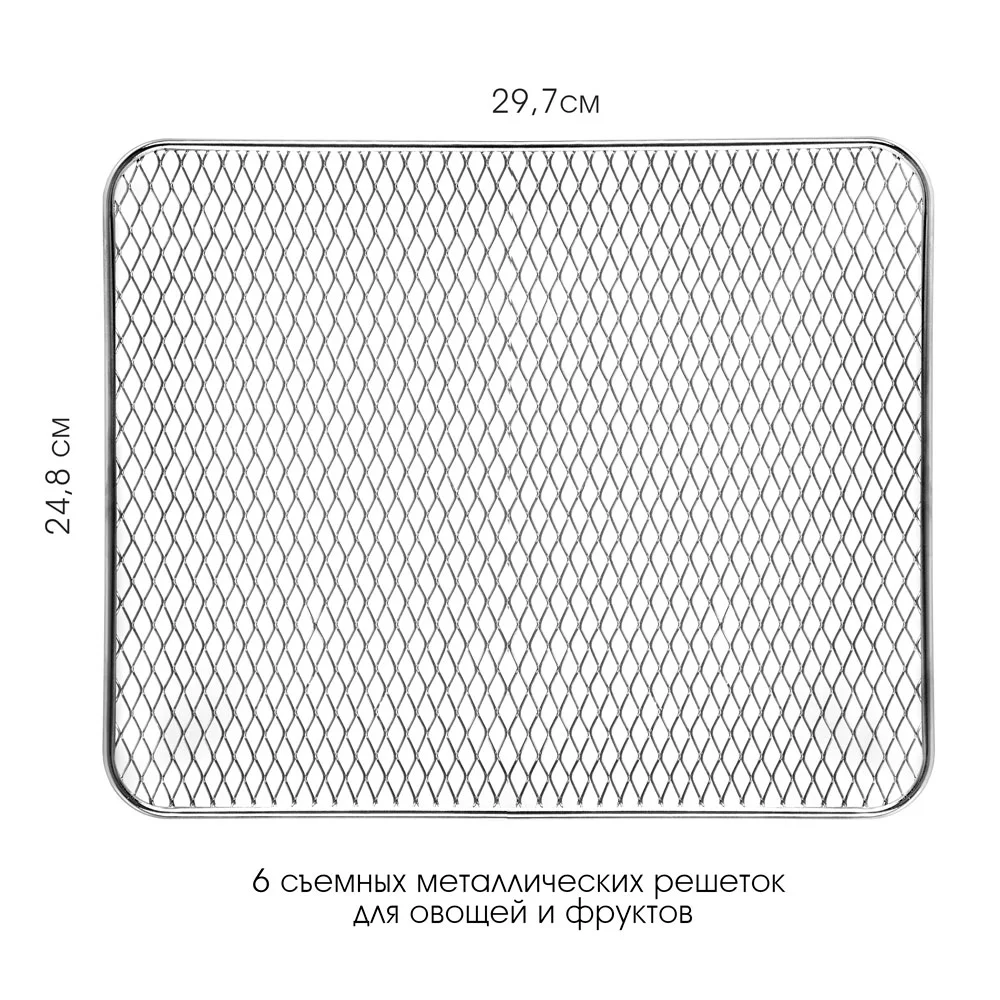 6 съемных металлических решеток для овощей и фруктов, Размер решетки: 24,8*29,7*0,5 см, Регулировка времени приготовления от 1 до 72 часов, Регулировка температуры приготовления от 35 до 70°С, Прозрачное окошко позволяет контролировать процесс сушки продуктов и их готовность, Система сушки с циркуляцией горячего воздуха позволяет сушить продукты быстрее, Удобное и понятное сенсорное управление, Автоматический вентилятор, Защита от перегрева, LED-дисплей , Звуковой сигнал при завершении работы |