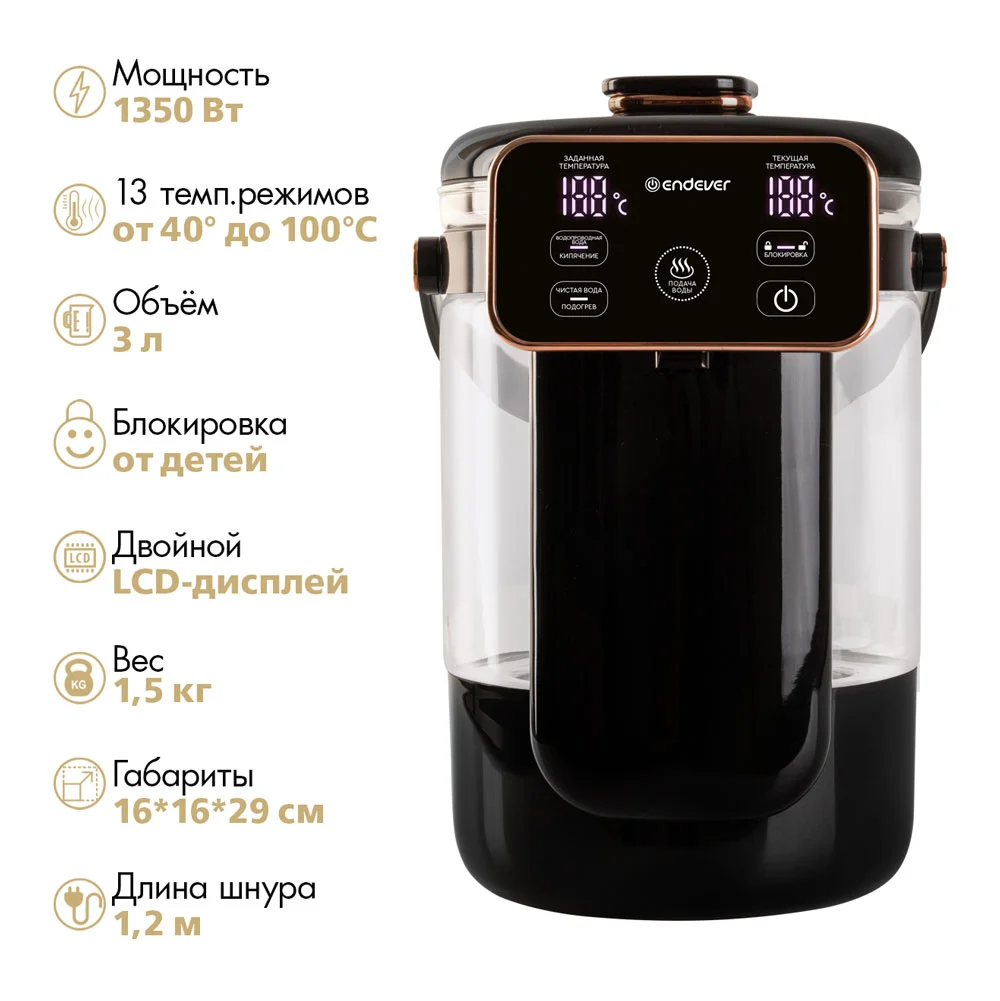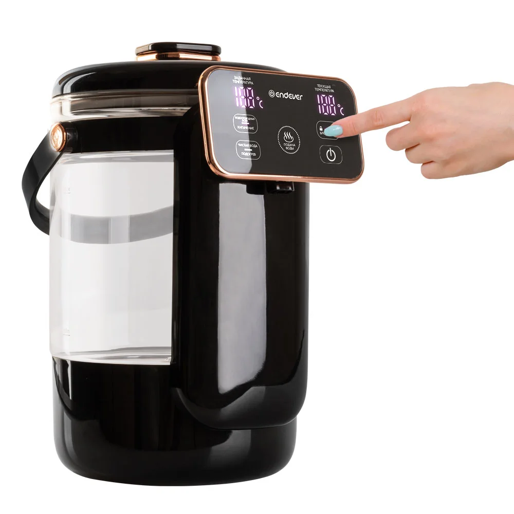 | Особенности и дополнительные функции | 13 температурных режимов: от 40°С до 100°С, Двойной LCD-дисплей, Сенсорная панель, Один способ розлива воды, Две функции нагрева, Автоналив: от 5 до 30 сек, Индикация включения, Функция чистая вода, Функция поддержания температуры, Функция отключения при недостаточном количестве воды, Резервуар из прочного боросиликатного стекла, Керамическая пластина нагрева без образования накипи, Защитная блокировка от детей, Ручка для переноски |