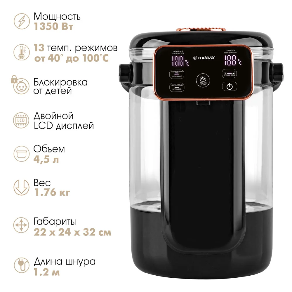 Термопот Endever Altea-2085 - это идеальное решение для тех, кто ценит комфорт и функциональность в быту. С мощностью 1350 Вт он быстро и равномерно нагревает воду до выбранной температуры от 40 до 100 градусов, благодаря чему вы всегда сможете наслаждаться горячим напитком по вашему вкусу.