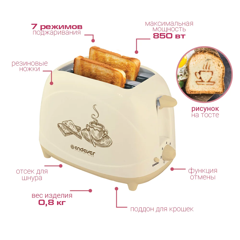 Привлекательный внешний вид тостера бежевого цвета с симпатичным рисунком на боку будет Вас радовать у себя на кухне. Прорезиненные ножки помогут зафиксировать тостер ENDEVER SkyLine ST-108 на любой поверхности. Корпус выполнен из термостойкой пластмассы и менее подвержен нагреву по сравнению с другими моделями. Есть отсек для хранения провода питания и лоток для сбора крошек.