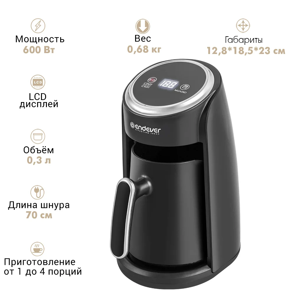 Для молотого кофе, Нагревательный элемент из нержавеющей стали, LCD дисплей, Можно использовать для кипячения воды и подогрева молока, приготовления какао или горячего шоколада, Двухсторонняя турка для удобного налива напитка в чашку, подходит как для правой, так и для левой руки, Приготовление от 1 до 4 порций, Автоматическое приготовление кофе |