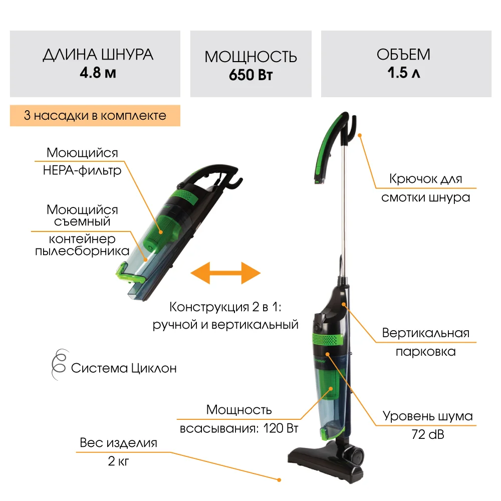 Мощность всасывания: 120 Вт, Система Циклон, Моющийся съемный контейнер пылесборника, Моющийся HEPA-фильтр, Высокая мощность всасывания, Конструкция 2 в 1: ручной и вертикальный, Крючок для смотки шнура, 3 насадки в комплекте, Вертикальная парковка |