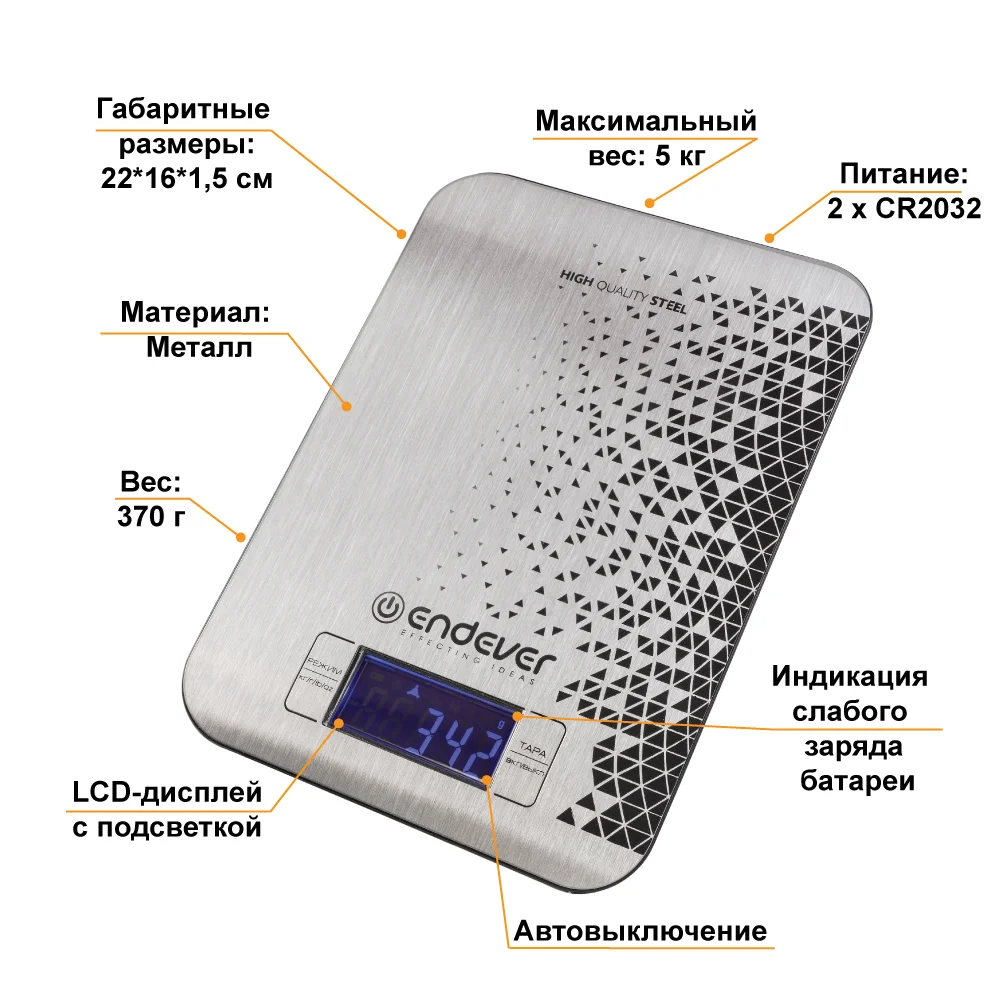 Система мер в килограммах, граммах (г), фунтах (lb) и унциях (oz), Современный удобный дизайн, LCD-дисплей с подсветкой, Функция обнуления веса тары, Индикация слабого заряда батареи, Автовыключение |