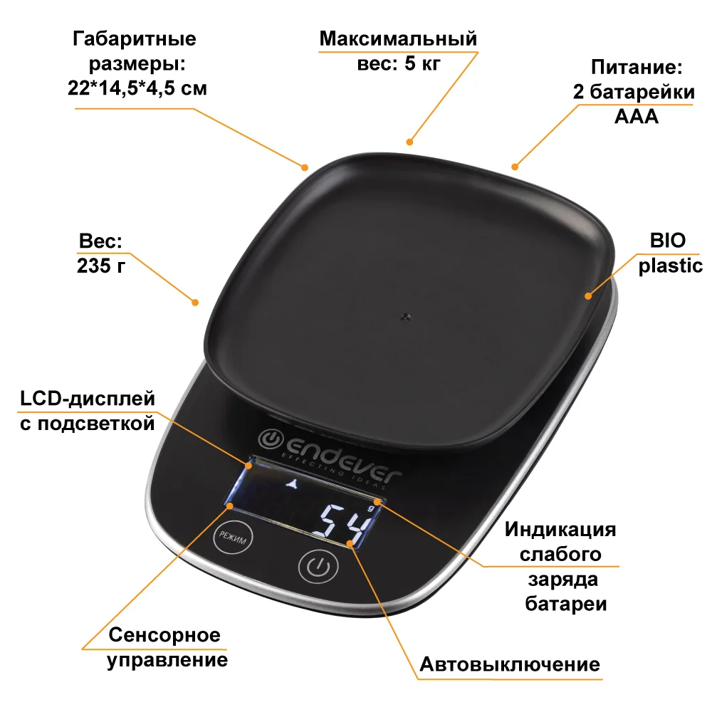 | Особенности и дополнительные функции | Система мер в граммах (г), фунтах (lb) и унциях (oz), Температура работы: 5 °С - 60 °С, Современный удобный дизайн, Сенсорное управление, LCD-дисплей с подсветкой, Функция обнуления веса тары, Индикация слабого заряда батареи, Автовыключение |
