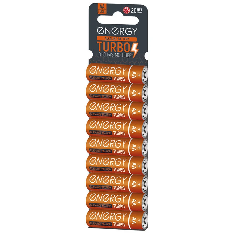 Батарейка алкалиновая Energy LR6/10KS Типоразмер - LR6 / АА Серия Turbo Улучшенная структура цинка Высокая плотность активных материалов Максимальная мощность Защита от протечек Стальной корпус с увеличенной толщиной стенки Срок предэксплуатационного хранения - 7 лет 10 шт в термоусадке с подвесом