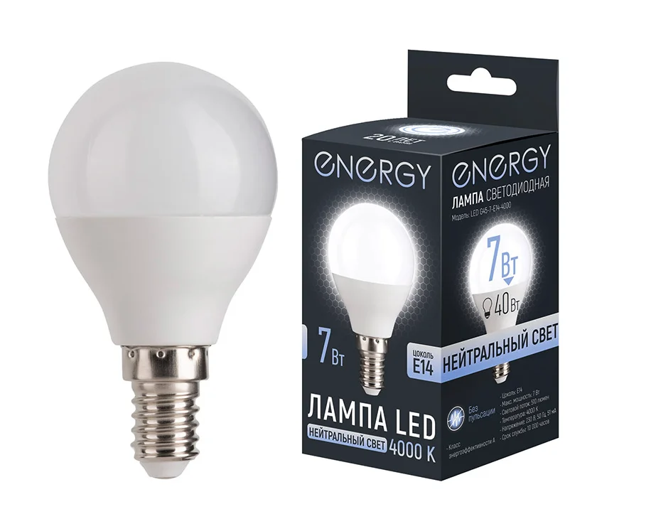 Лампа светодиодная Energy LED G45-7-E14-4000 Цоколь E14 Световой поток 510 люмен Срок службы 10 000 часов Цветовая температура 4000 К (нейтральный свет) Класс энергоэффективности А Без пульсации Напряжение 230 В, 50 Гц Диаметр 4,5 см Высота 8,2 см Мощность аналога лампы накаливания 40 Вт Мощность 7 Вт