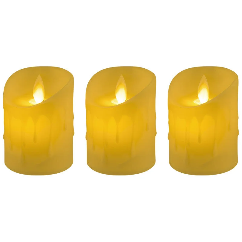 Набор из 3 штук светодиодных свечей Работа от батареек 6 * AAA для 3-х свечей (в комплект не входят) Пластиковый язычок имитирует пламя Упаковка ПВХ бокс с цветным вкладышем