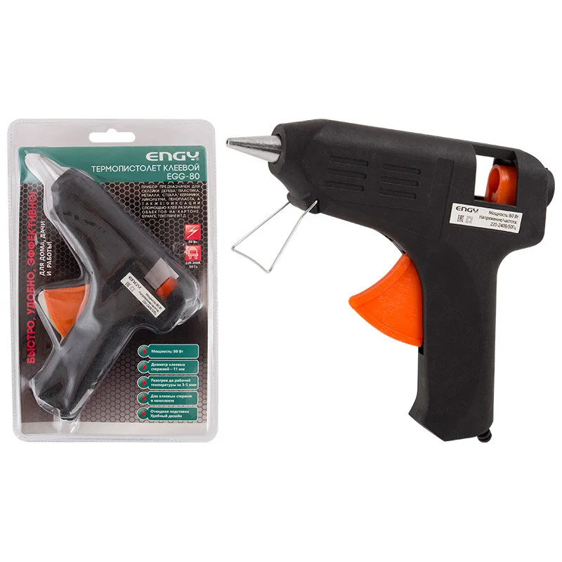 Назначение: прибор предназначен для склейки дерева, пластика, металла, стекла, керамики, линолеума, пенопласта, а так же фиксации с помощью клея различных объектов на картоне, бумаге и текстиле и т.д Может использоваться при работах по герметизации. Напряжение/Частота: 220-240В/50Гц Мощность: 80Вт Диаметр клеевых стержней: 11 мм Разогрев до рабочей температуры за 3-5 мин Два клеевых стержня в комплекте Удобный дизайн Длина шнура питания - 92 см Откидная подставка для возможности поставить прибор в перерывах между работой по склеиванию. Материалы: Металл, пластик, резина упаковка - двойной блистер
