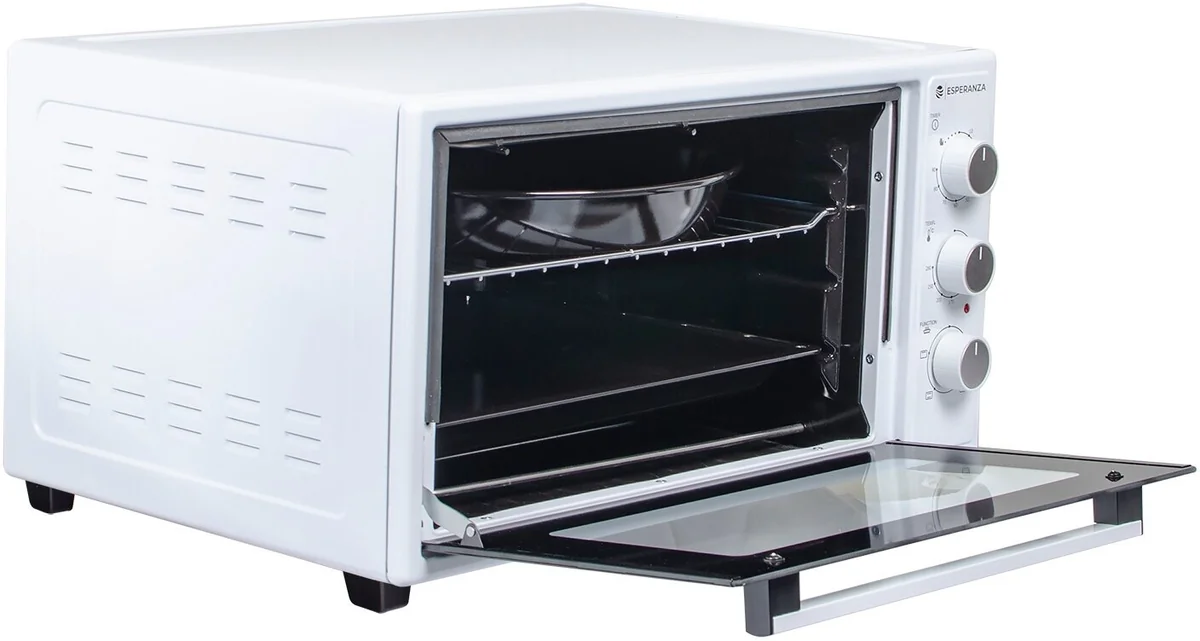 Мини-печь ESPERANZA TO-60CD W выполнена в белом цвете и имеет режим конвекции для равномерного распределения тепла внутри печи.