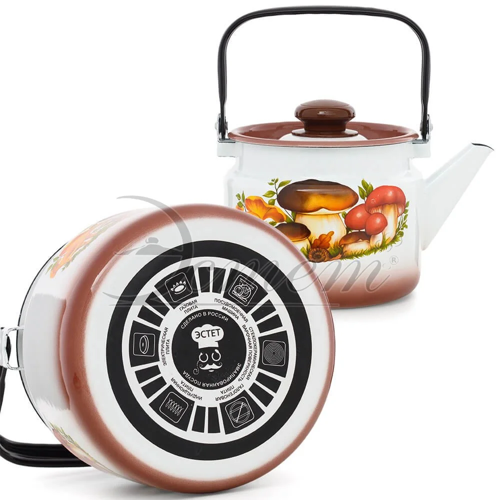 Чайник Эстет изготовлен из высококачественного стального проката и покрыта стеклокерамической эмалью. Внутри и снаружи - трехслойное глянцевое эмалированное покрытие. Эмалевое покрытие, являясь стекольной массой, не вызывает аллергию и надежно защищает пищу от контакта с металлом. Кроме того, такое покрытие долговечно, оно устойчиво к механическому воздействию, не царапается и не "сходит", а стальная основа практически не подвержена механической деформации, благодаря чему срок эксплуатации увеличивается. Крышка с эмалированным покрытием оснащена удобной ручкой. Подходит для всех типов плит, включая индукционные. Можно мыть в посудомоечной машине.