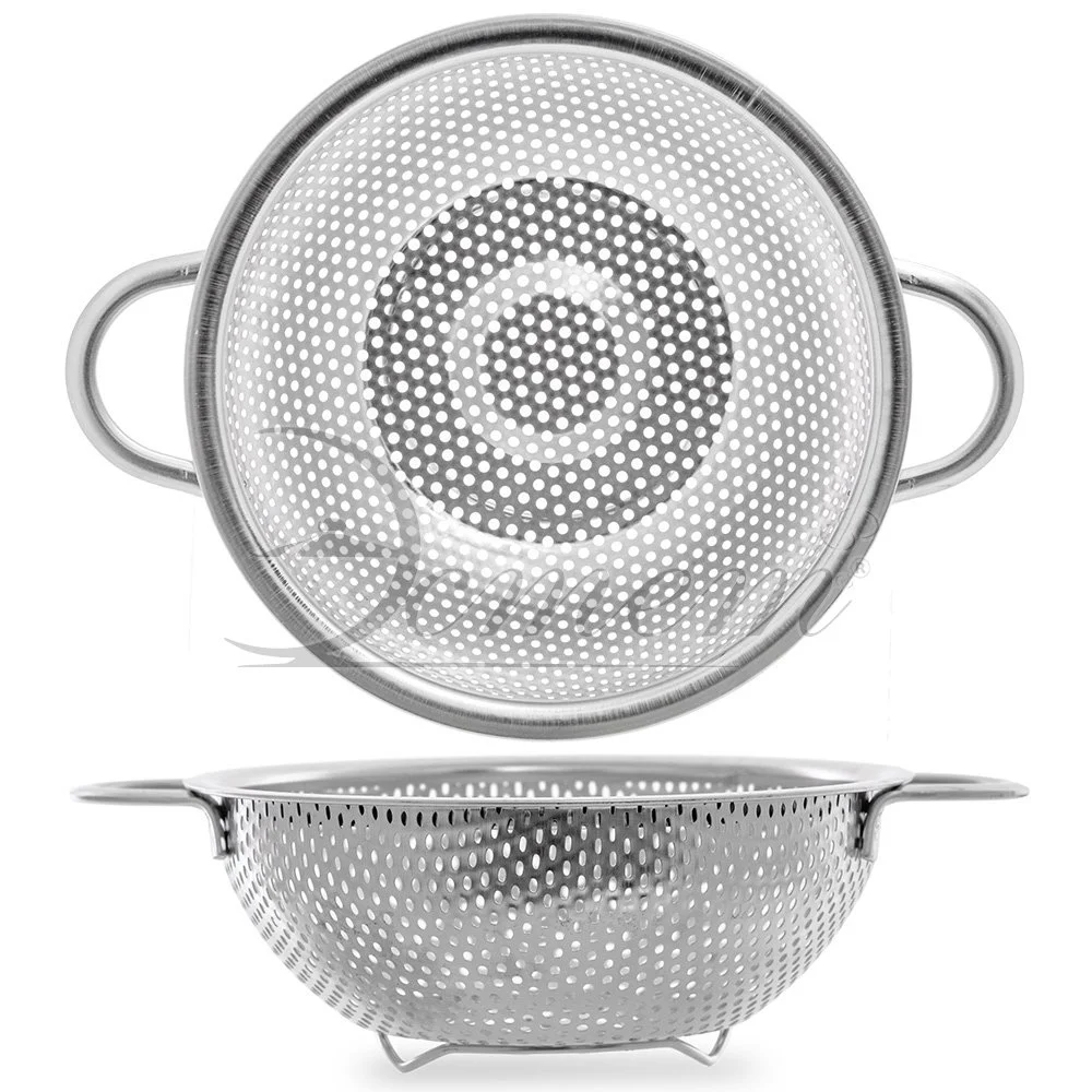 Друшлаг 2-ручки Материал: нержавеющая сталь Диаметр 16 см .Дуршлаг широко используется на кухне при приготовлении блюд. Он предназначен для отделения жидкости от твёрдых веществ, например, после варки пасты, круп, картофеля и пр. Также дуршлаг используется для мытья и промывания ягод, грибов, мелких фруктов и овощей, а также отцеживания творожной сыворотки. Благодаря ножкам изделие можно поставить прямо в раковину. Подходит для чистки в посудомоечной машине.