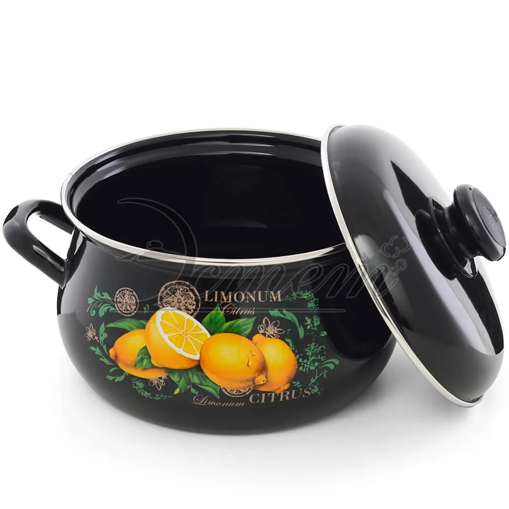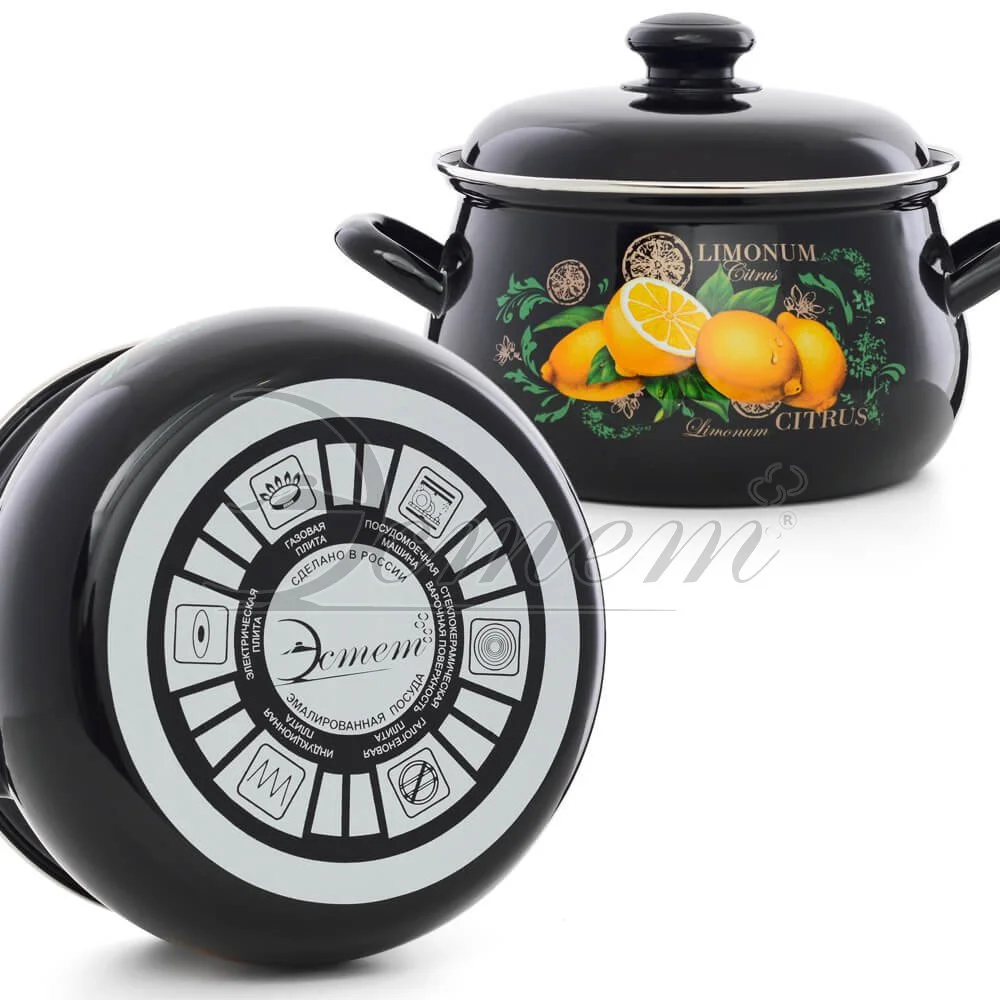 Кастрюля Эстет "Цитрус" изготовлена из высококачественного стального проката и покрыта стеклокерамической эмалью. Внутри и снаружи - трехслойное глянцевое эмалированное покрытие. Эмалевое покрытие, являясь